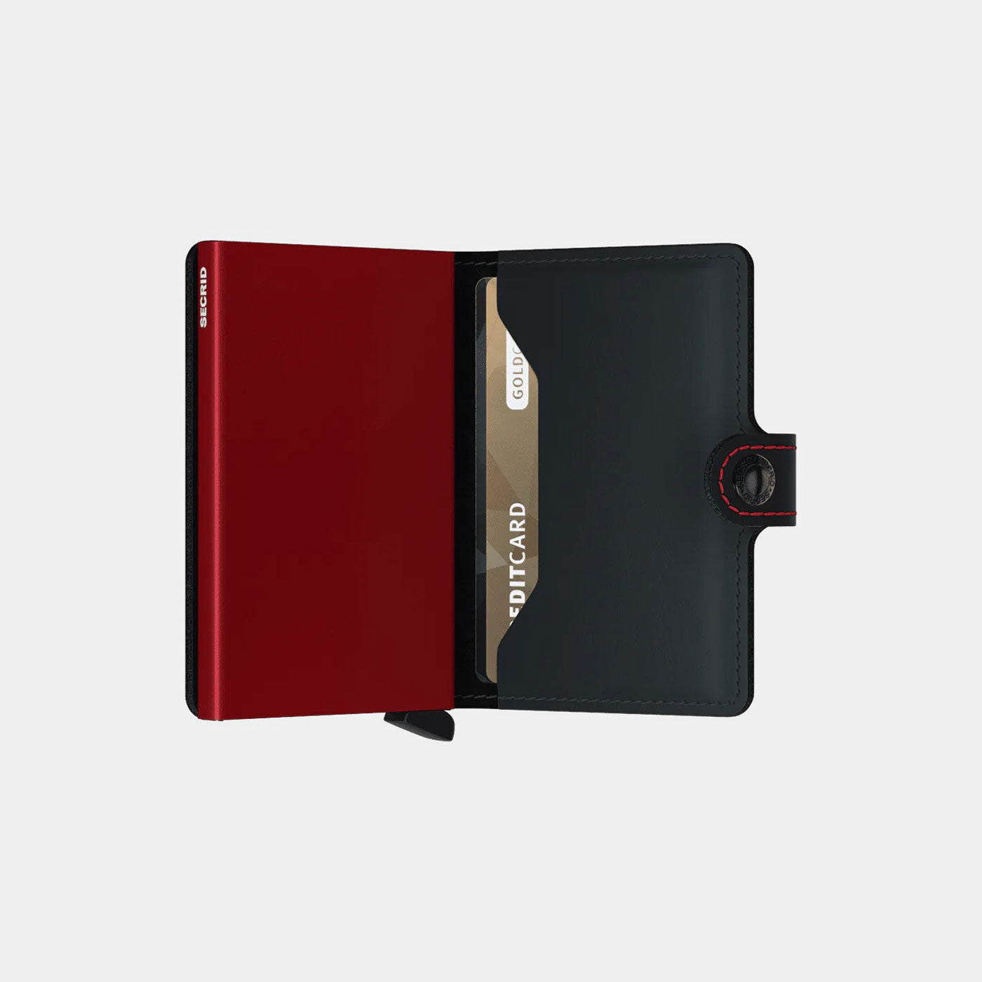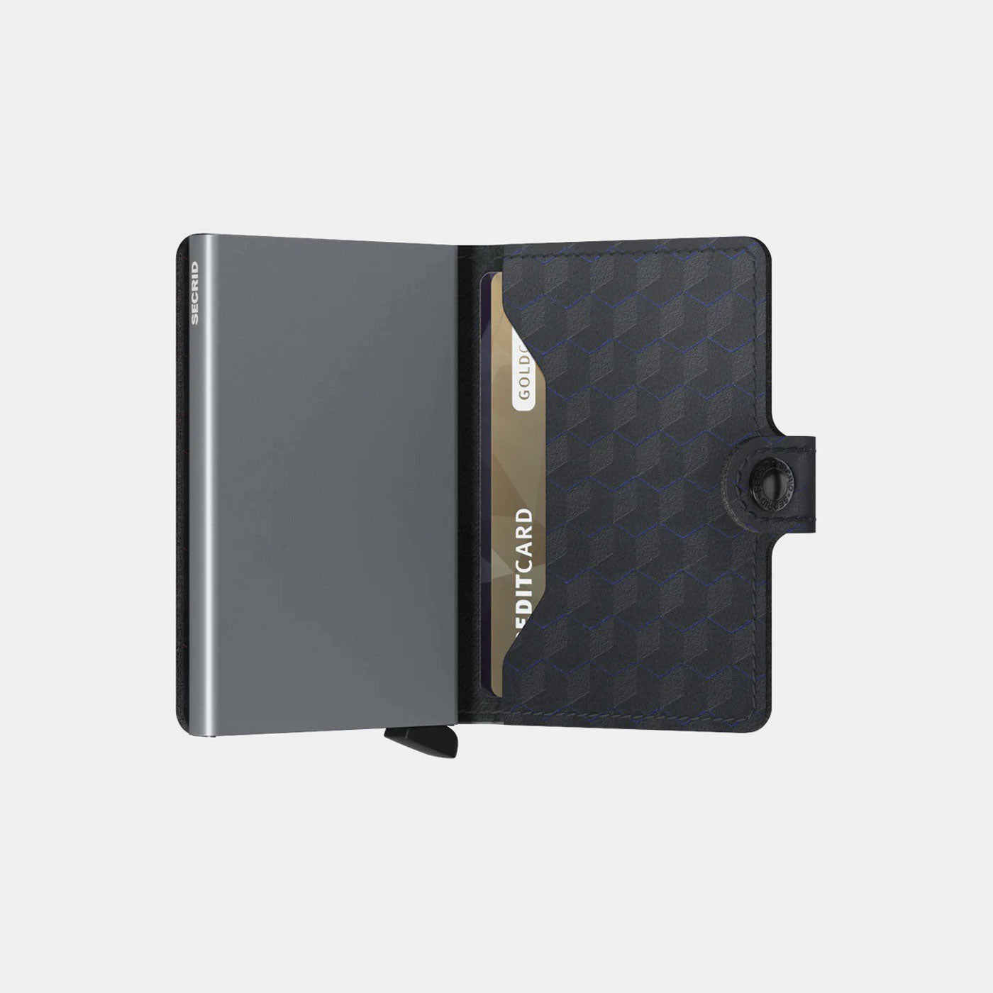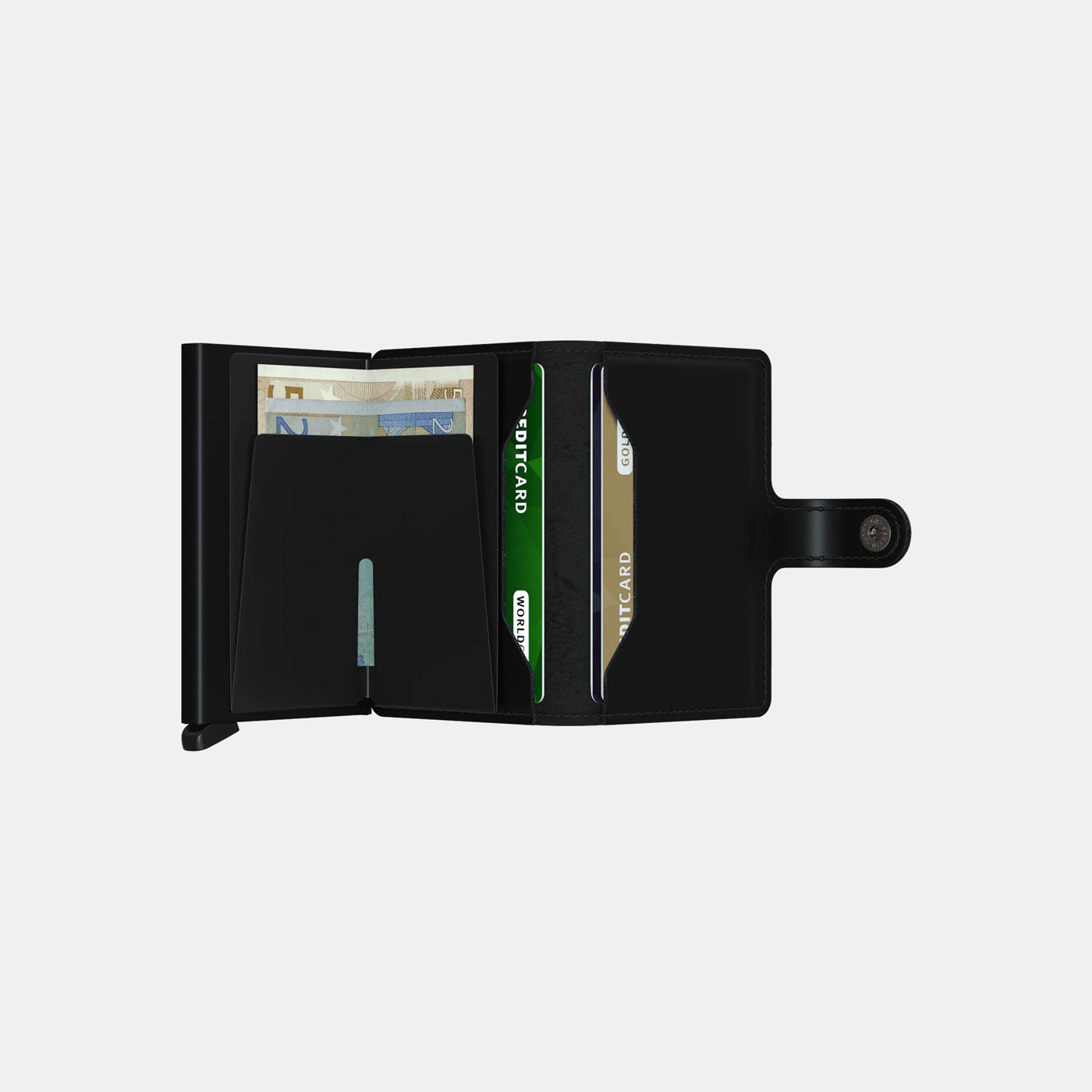 De tamanho pequeno, mas com uma capacidade surpreendentemente grande: a Miniwallet satisfaz todas as necessidades. A capa exterior pode conter notas, bilhetes e cartões, enquanto o Cardprotector de alumínio permite retirar os cartões com um simples movimento, evitando que se dobrem, partam ou sejam lidos sem que nos apercebamos.