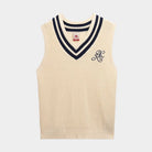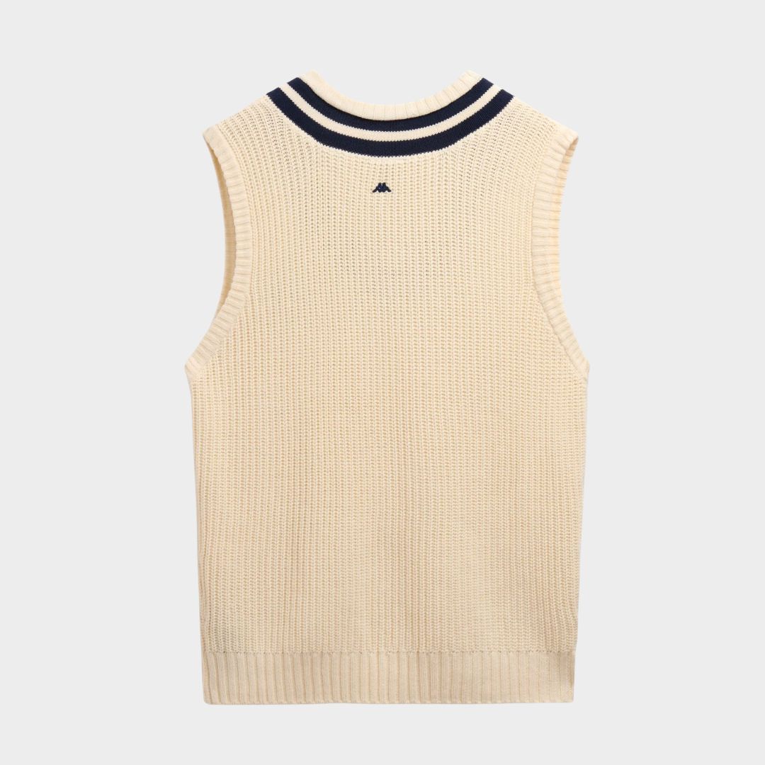 Chaleco para hombre. Corte holgado. Confeccionado en hilo de algodón, punto cárdigan, cuello acanalado con rayas y bordado en el pecho. Logotipo de Omini en el centro de la espalda.