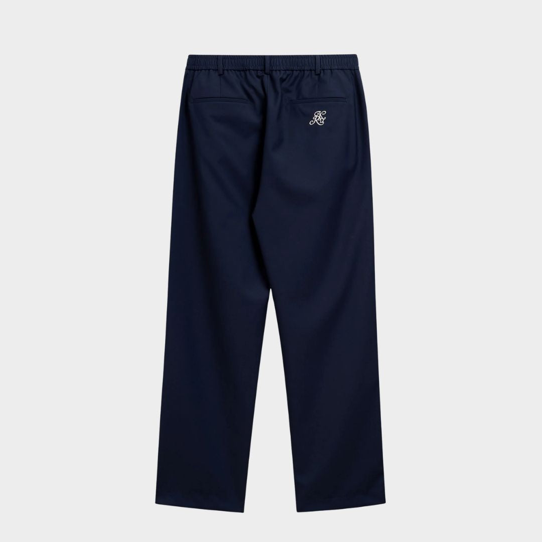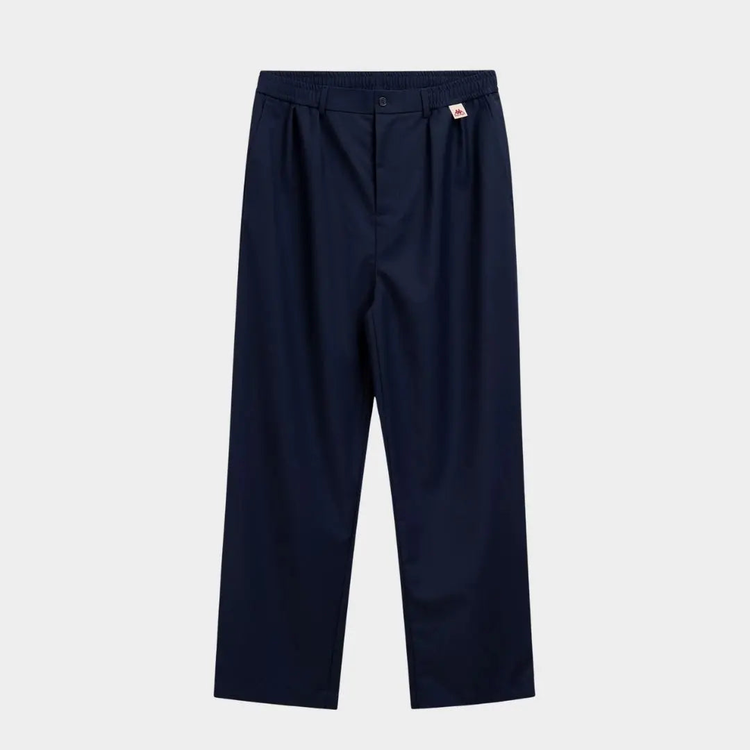 Herrenhose. WEITERE PASSFORM. Hergestellt aus kühler Wolle, elastischer Bund mit Knopf und Reißverschluss, einfache vordere Abnäher. Stickerei unter der rechten Gesäßtasche. Jacquard-Etikett mit dem Omini-Logo unter dem Gürtel auf der linken Vorderseite eingearbeitet.