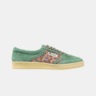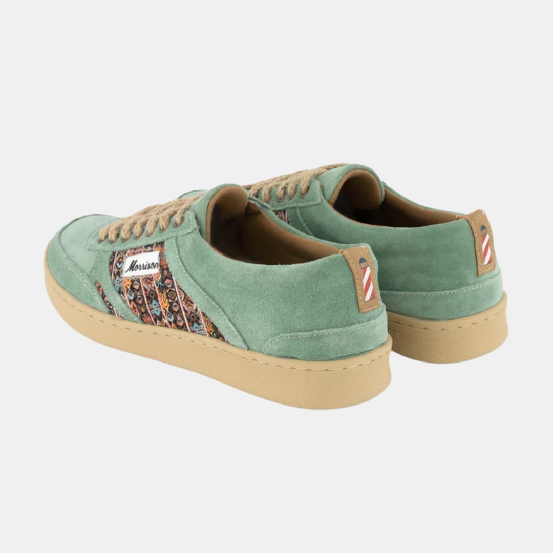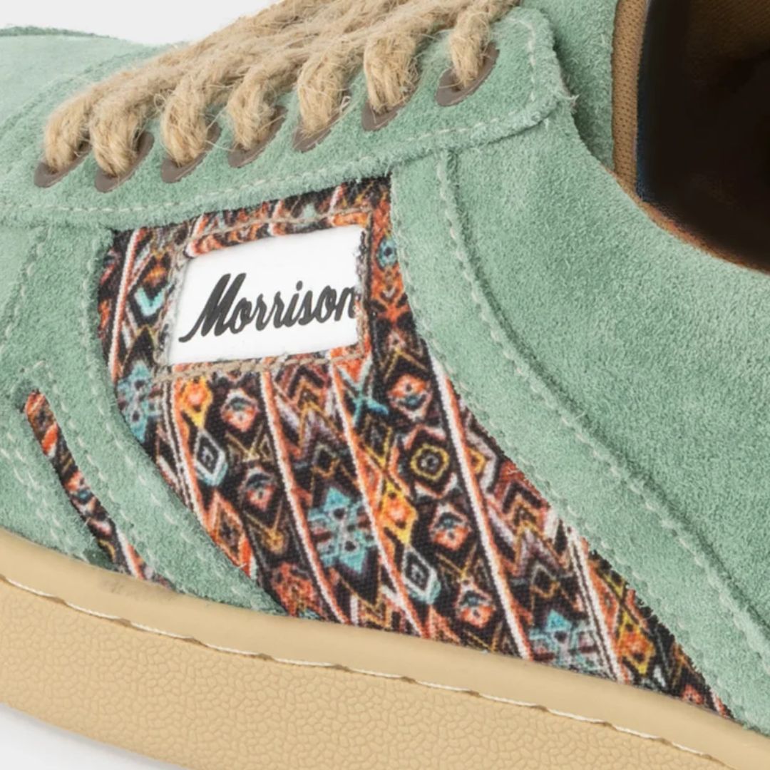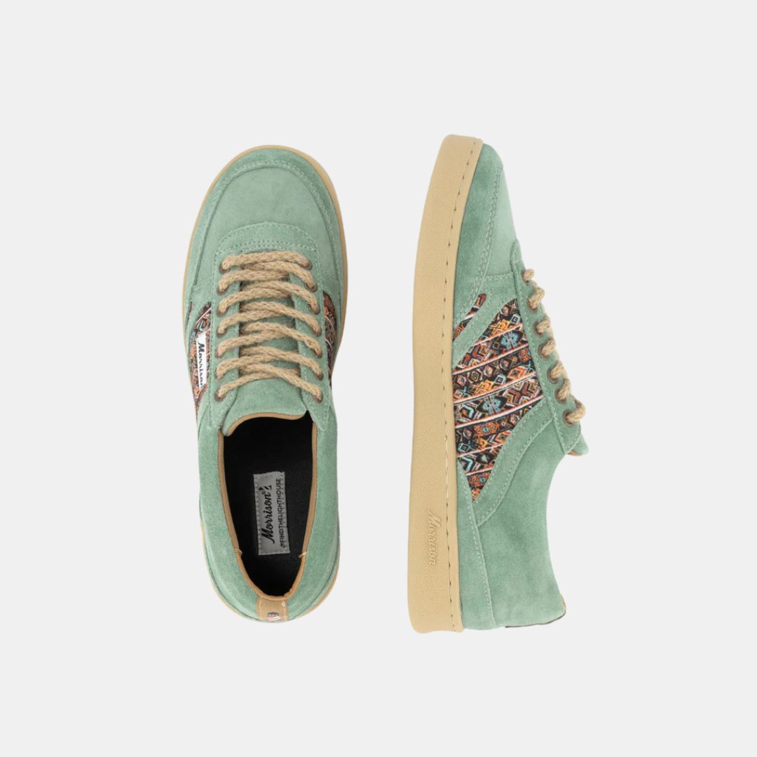 Die Nineties Maya sind bereits zu einem der Ikonen der Marke geworden. Hergestellt aus mintgrünem Veloursleder mit ihrem ethnischen Muster und Jutebändern, die ihnen einen einzigartigen Touch verleihen. Vanillefarbene Sohle.