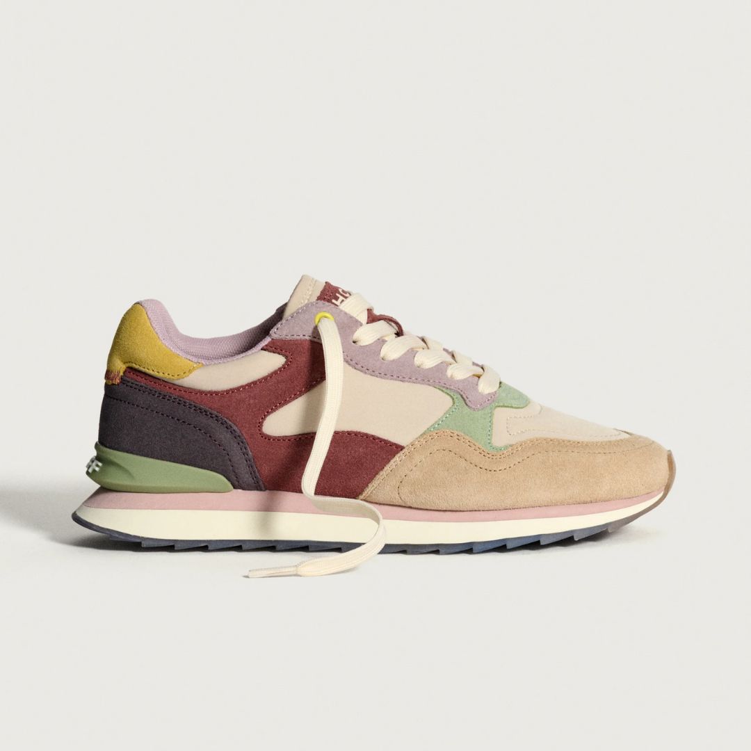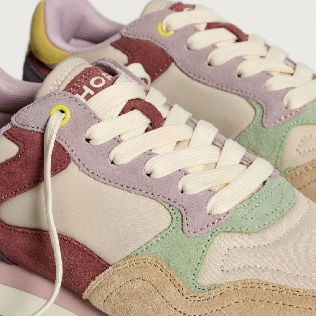 Sneaker im 'Retro'-Stil mit Farbkombinationen und Materialien. Logodetail an der Rückseite. Siebdrucksohle. Verschluss mit Schnürsenkeln.