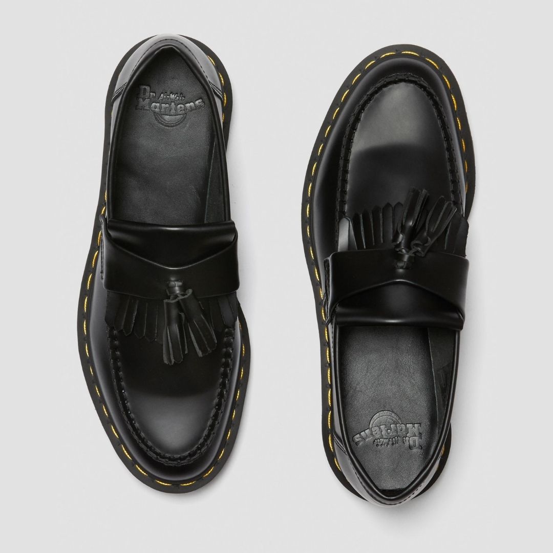 The subcultural favorite, the tassel Adrian loafer, has been one of our most iconic DMs for decades. Built from our classic Smooth leather and detailed with a double tassel and fringes. The loafer features the unmistakable DM DNA: a two-tone grooved sole and the iconic yellow stitching.