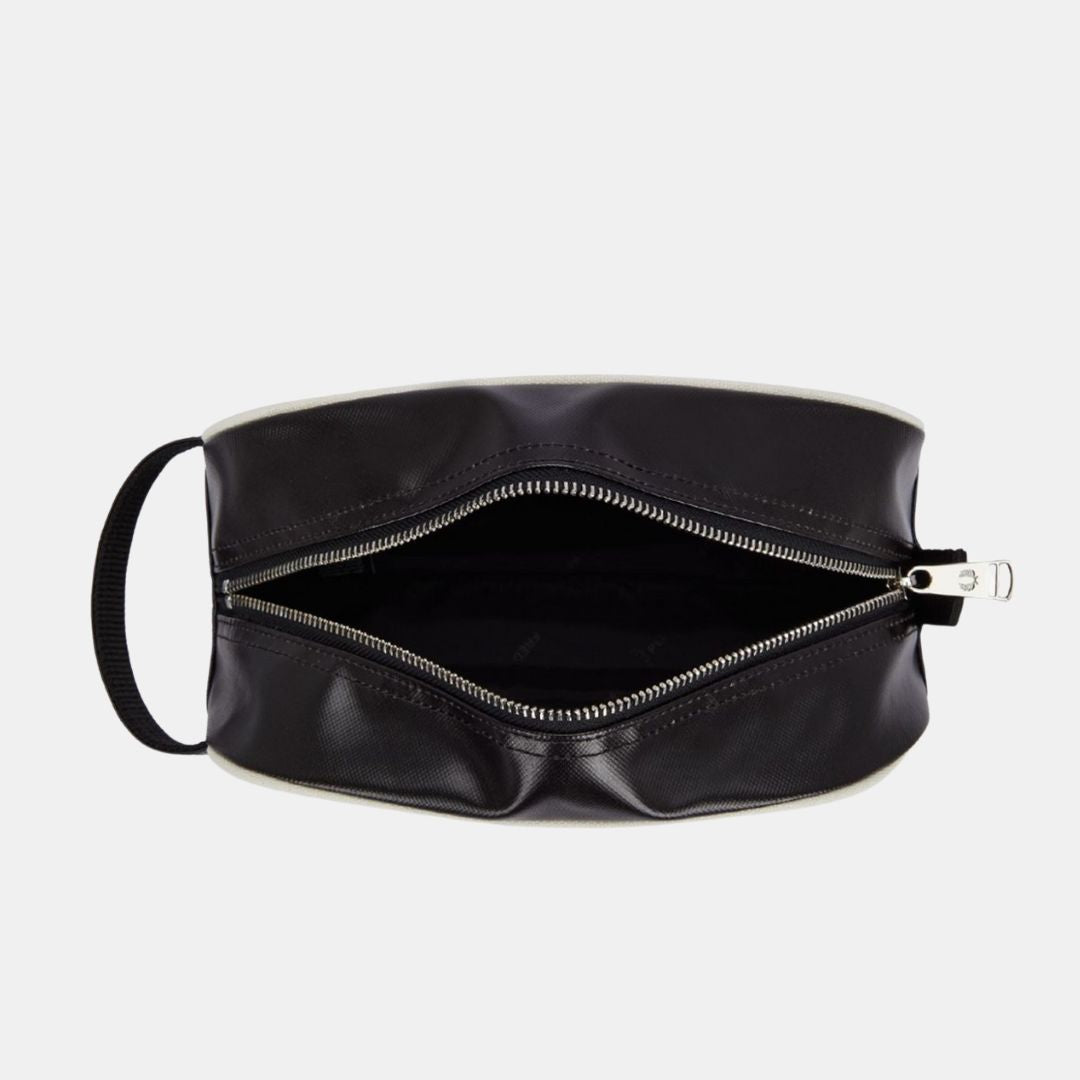The toiletry bag made from recycled materials with lining and decorated with the stripes of our distinctive trim and the house logo in metallic gold tone.