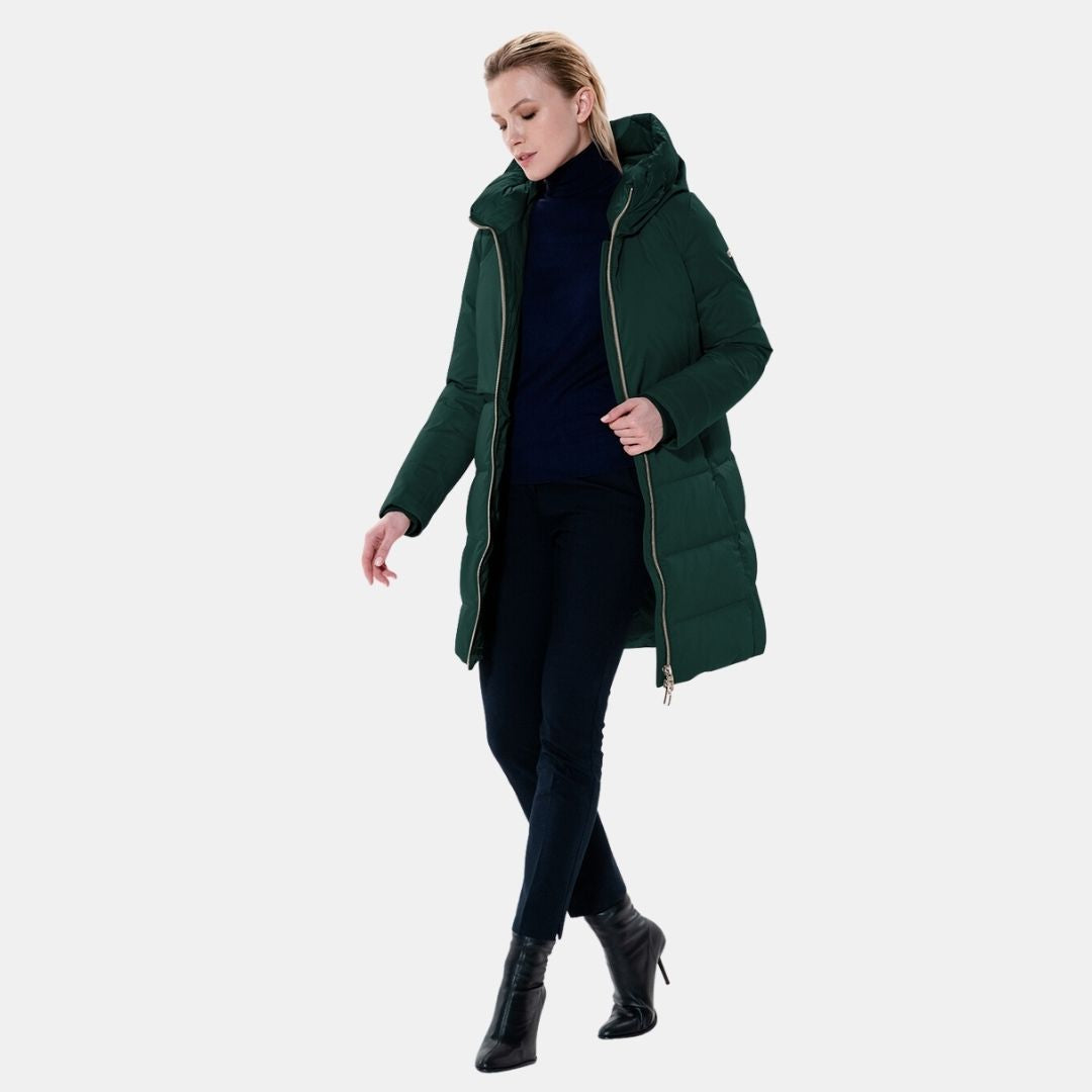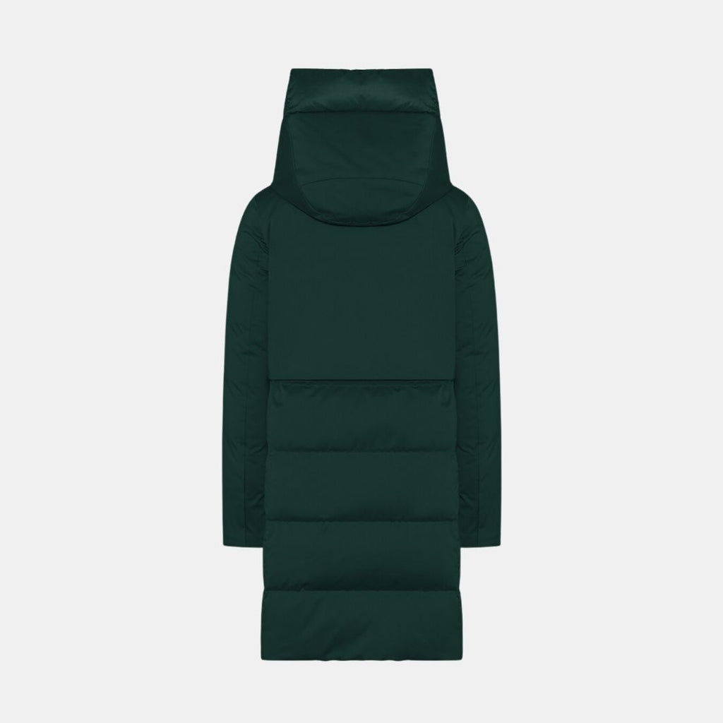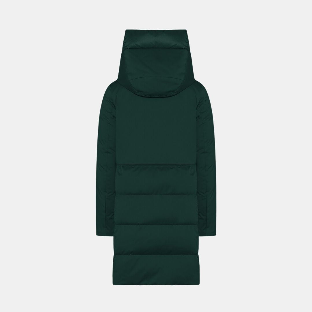 Bi-material down jacket in wool and technical satin fabric. Front closure with double-slider zipper and hidden side pockets with invisible zipper. span>The garment features a padded hood edge in superlight technical fabric and internal cuff in technical knit.