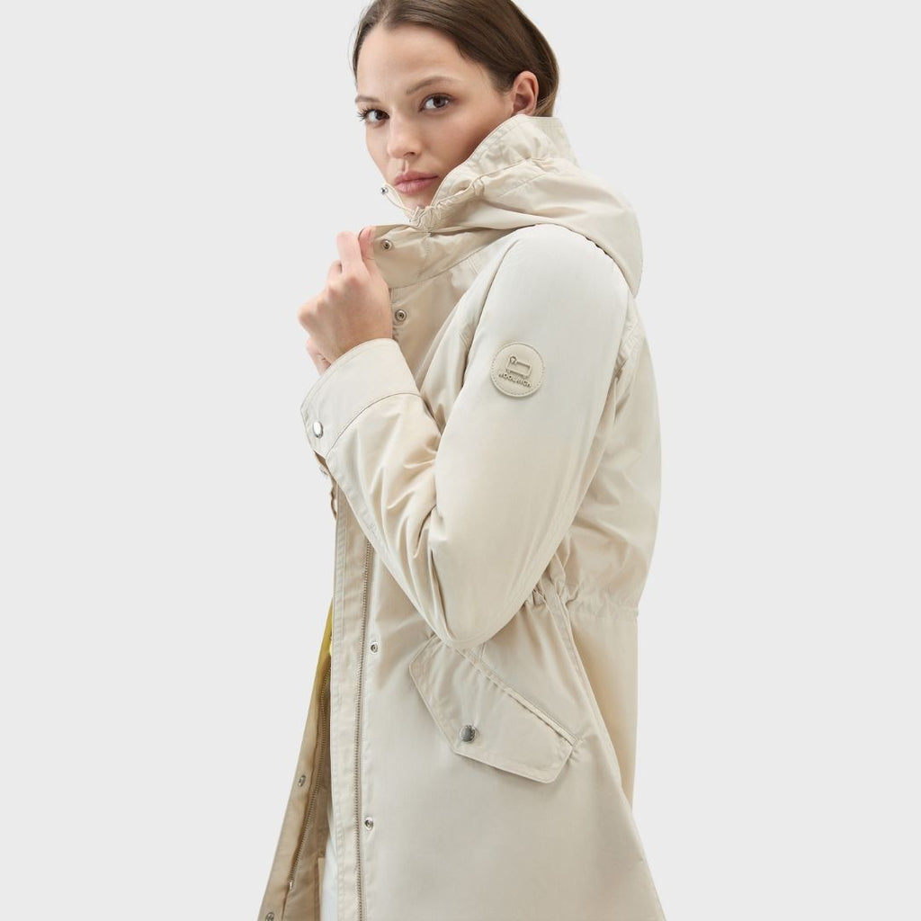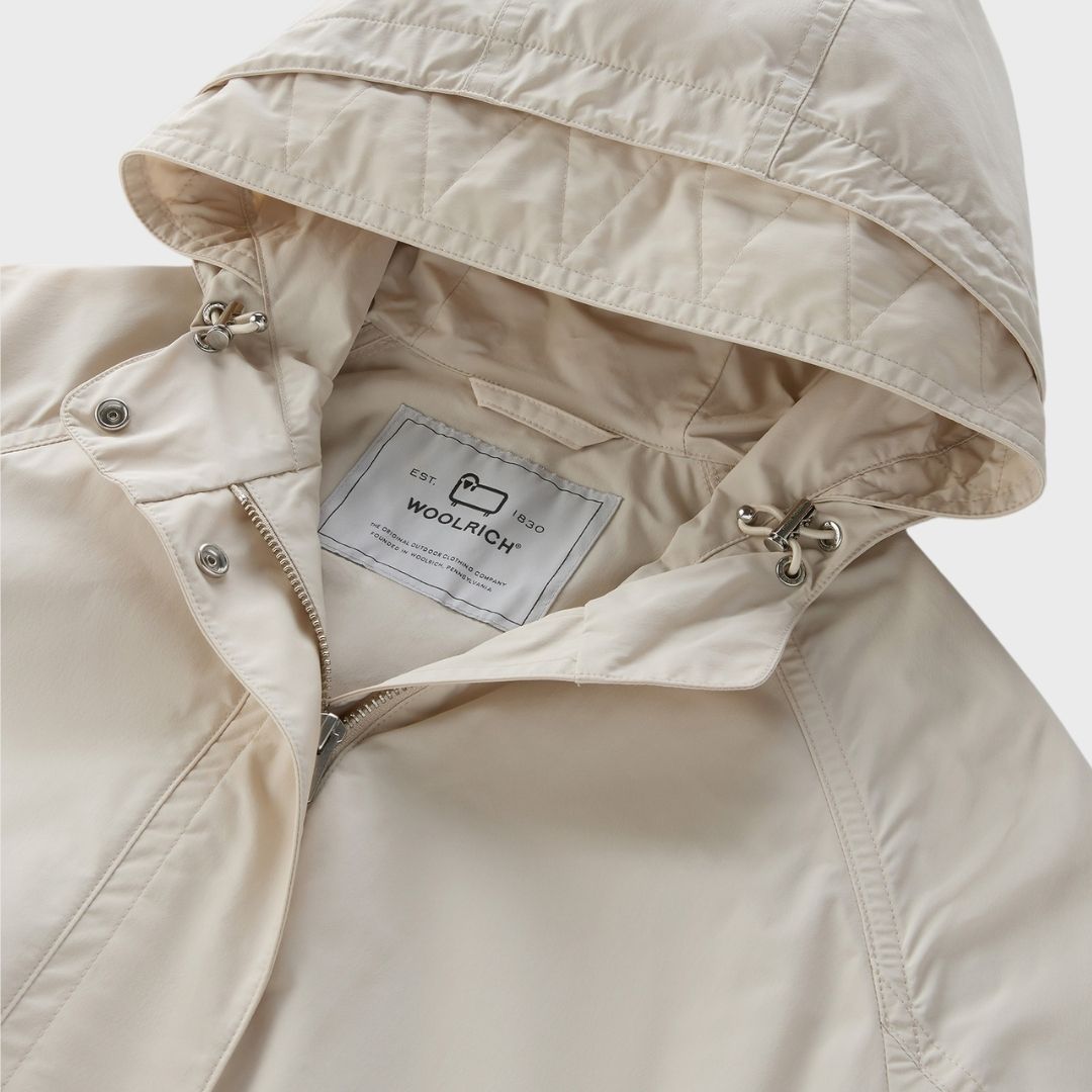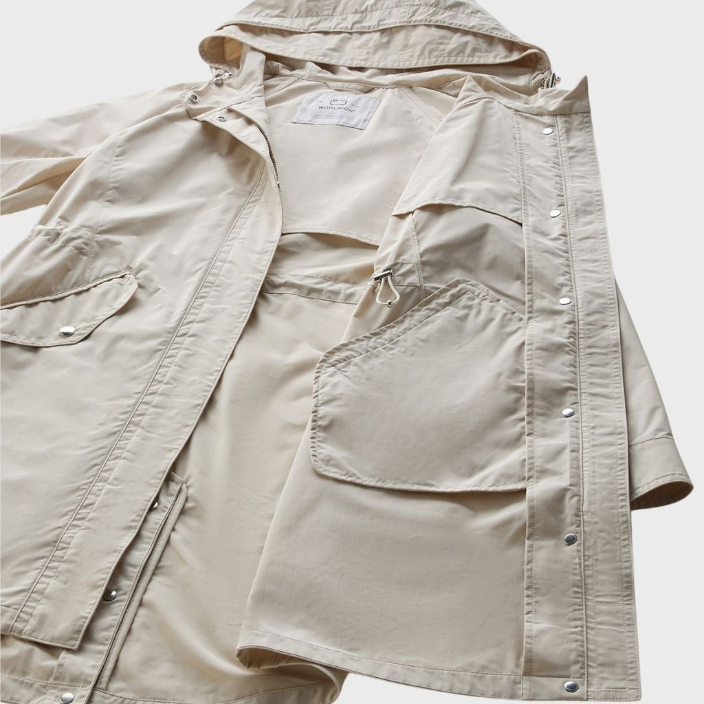 This parka is inspired by Woolrich's Arctic Parka, although it gives the iconic model a light consistency for the warm seasons. It is made with water-repellent and wind-resistant Urban Touch fabric to ensure comfort and protection against light rain. Its lines are clean and it has functional details such as the adjustable hood with visor. It features a hidden zip and snap button closure, adjustable snap button cuffs, slash pockets with flaps and a back opening with snap buttons. The internal drawstring allows you to adjust the fit.