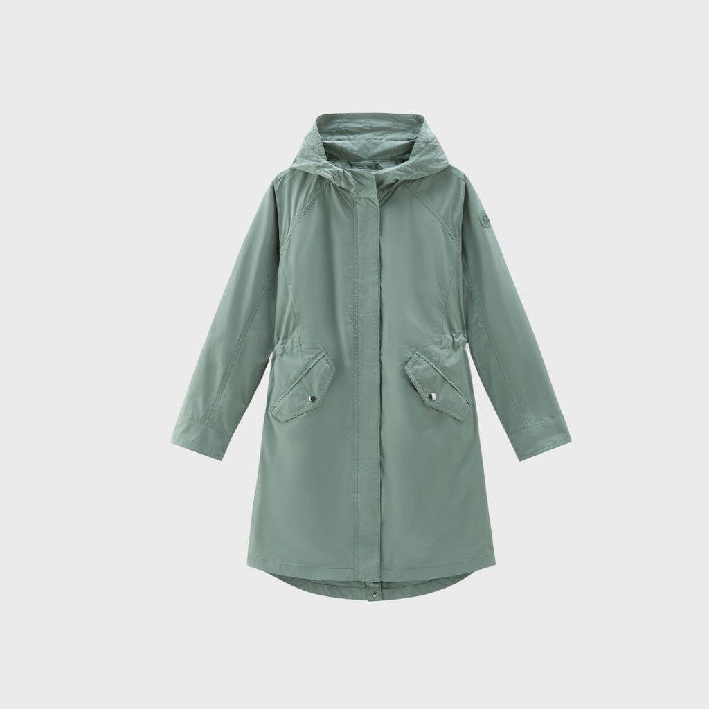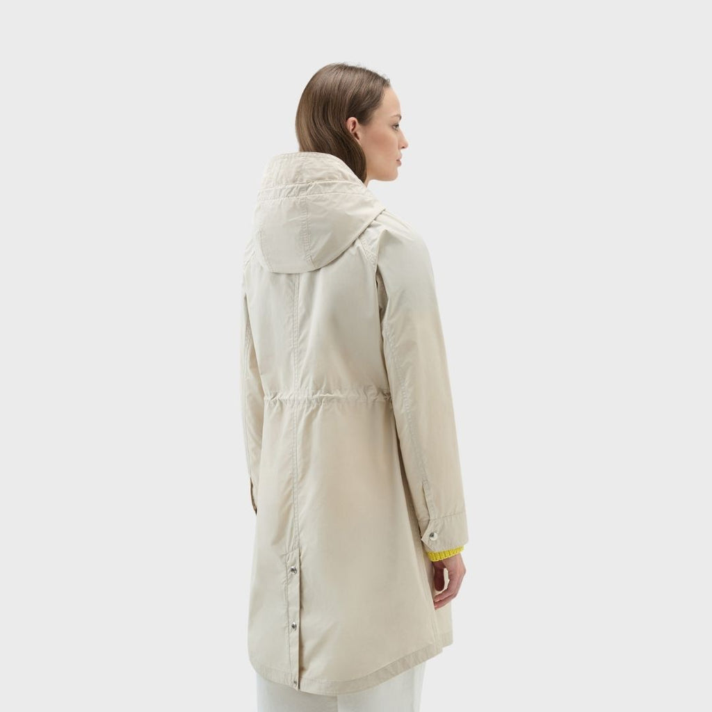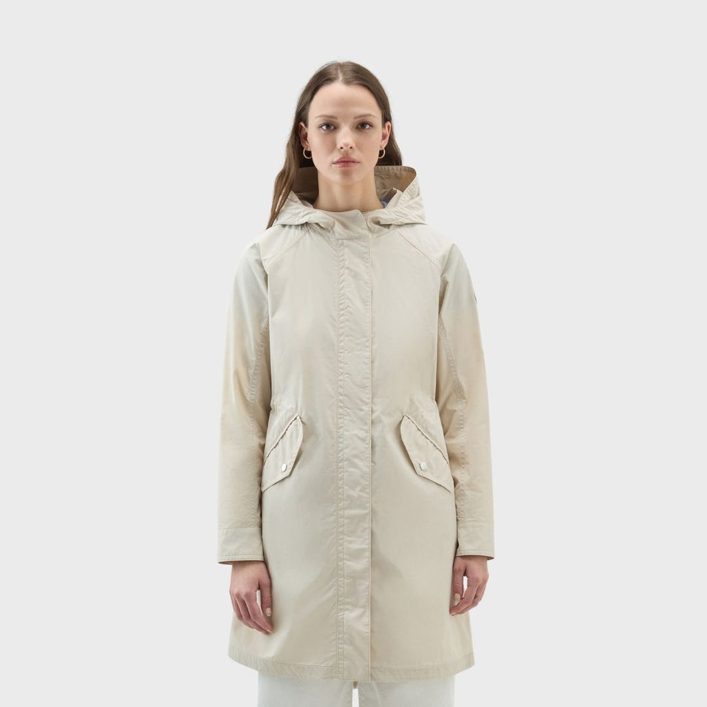 This parka is inspired by Woolrich's Arctic Parka, although it gives the iconic model a light consistency for the warm seasons. It is made with water-repellent and wind-resistant Urban Touch fabric to ensure comfort and protection against light rain. Its lines are clean and it has functional details such as the adjustable hood with visor. It features a hidden zip and snap button closure, adjustable snap button cuffs, slash pockets with flaps and a back opening with snap buttons. The internal drawstring allows you to adjust the fit.