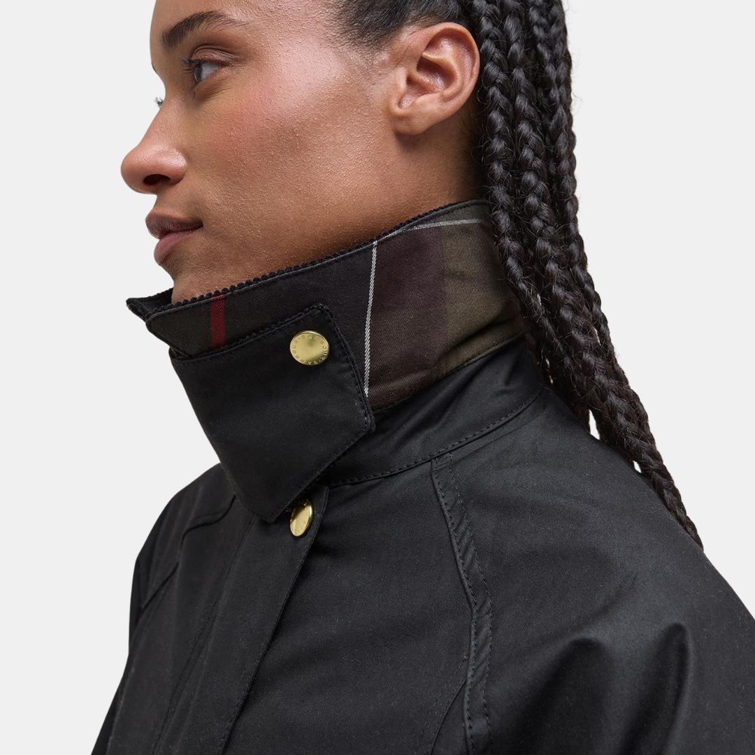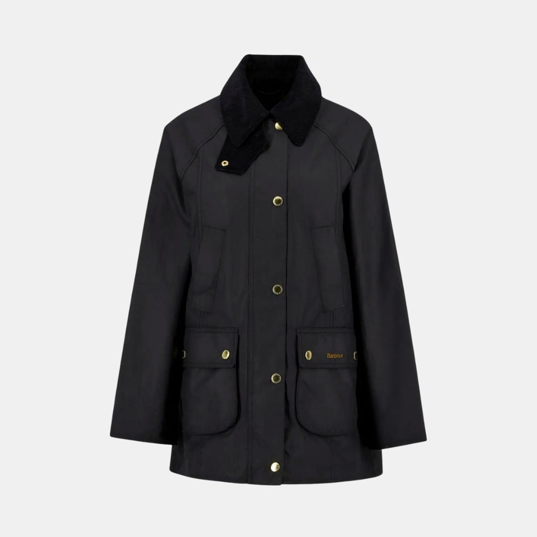The Beadnell waxed jacket has been part of Barbour's waxed jacket collection since 2010, offering a feminine and tailored version of the successful men's Bedale waxed jacket. This season, the Barbour Modern Beadnell waxed jacket gives a contemporary touch to the original, with a regular cut and an exaggerated corduroy collar. Finished with shiny gold branded snap buttons and double studded vents at the back, it is perfect for enhancing your favorite waxed garment.