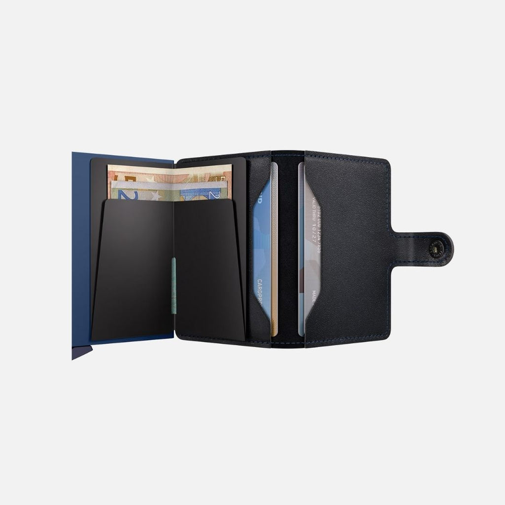 Small in size but with a surprisingly large capacity: the Miniwallet meets all needs. The outer cover can contain bills, tickets and cards, while the aluminum Cardprotector allows the cards to be removed with a simple movement, preventing them from being bent, broken or read without us realizing it.