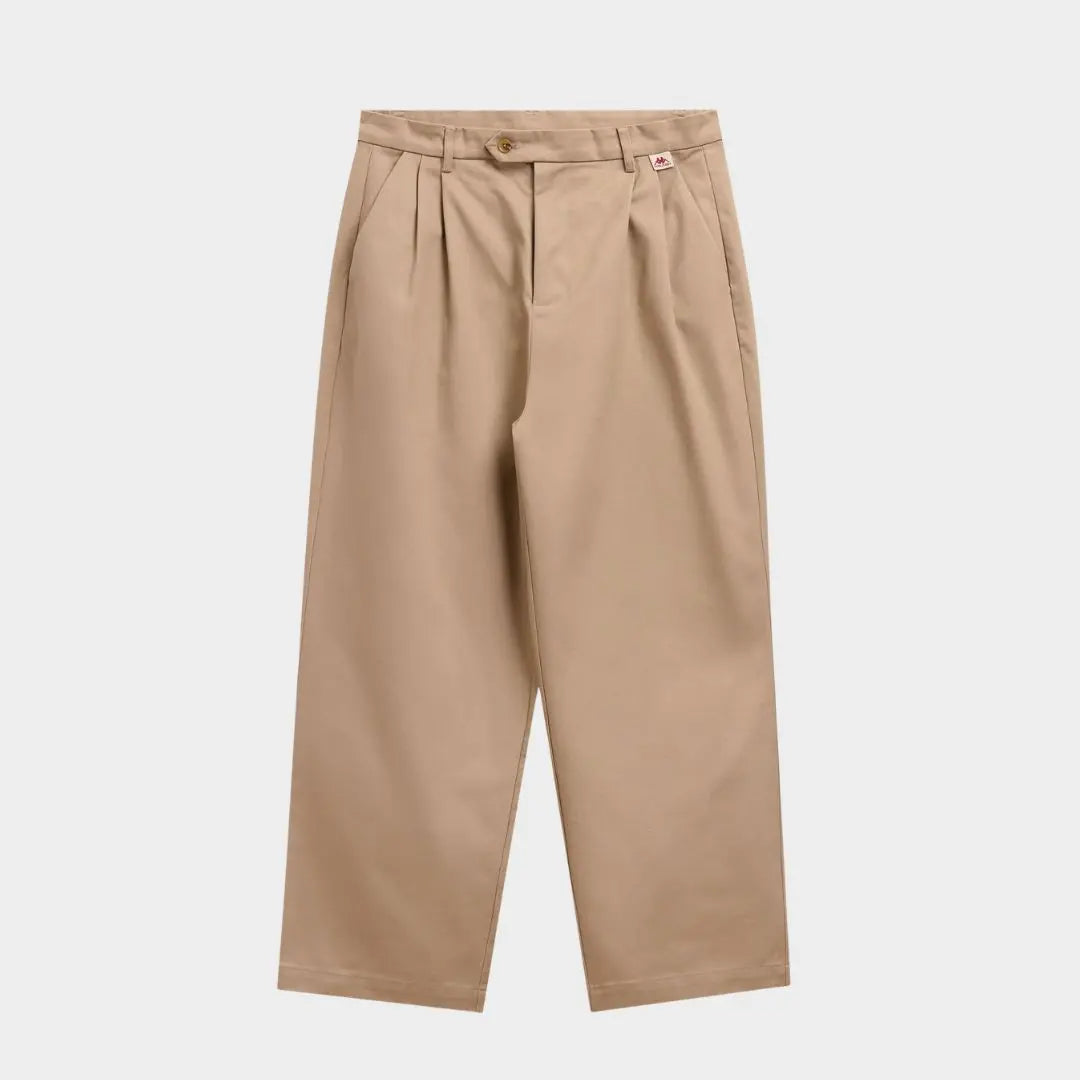 Pantalones chinos para hombre. AJUSTE ANCHO. Confeccionados en gabardina ligera de algodón, con cierre de botón y cremallera, y doble pinza frontal. Bordado sobre el bolsillo trasero derecho. Etiqueta de jacquard con el logotipo de Omini insertada bajo el cinturón en la parte delantera izquierda.