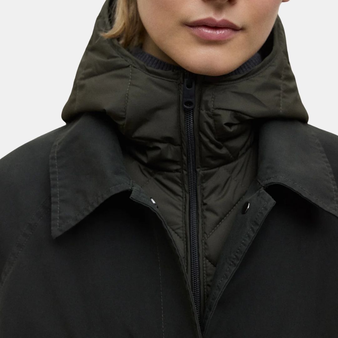 El abrigo Hyden está confeccionado con 54% Poliéster reciclado y 46% Algodón orgánico, con relleno de 100% Poliéster reciclado. El poliéster reciclado reduce el uso de recursos fósiles, emisiones de CO2 y consumo de agua y energía, al reutilizar residuos plásticos como botellas PET, manteniendo las propiedades del poliéster virgen. Prenda exterior: