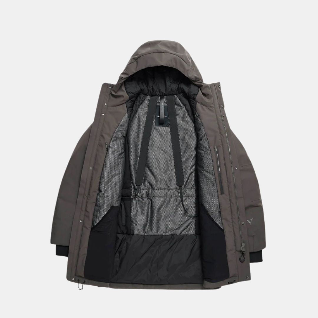 Parka técnica de invierno DSUP fabricada con tejido impermeable funcional. El aislamiento se produce a partir de botellas de plástico completamente recicladas. Equipada con un forro con protección térmica equilibrada y correas internas para llevarla sobre los hombros.