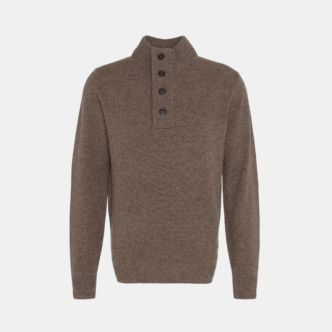 Confeccionada en 100 % lana, esta sudadera Barbour presenta coderas de cuero que evocan la vida rural. Esta prenda cuenta con cuello chimenea abotonado y mangas largas, perfectas para abrigarse y abrigarse.