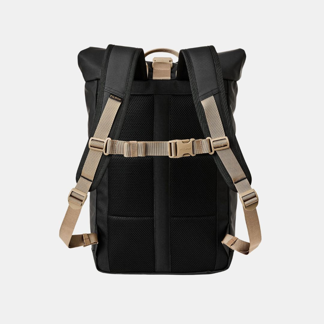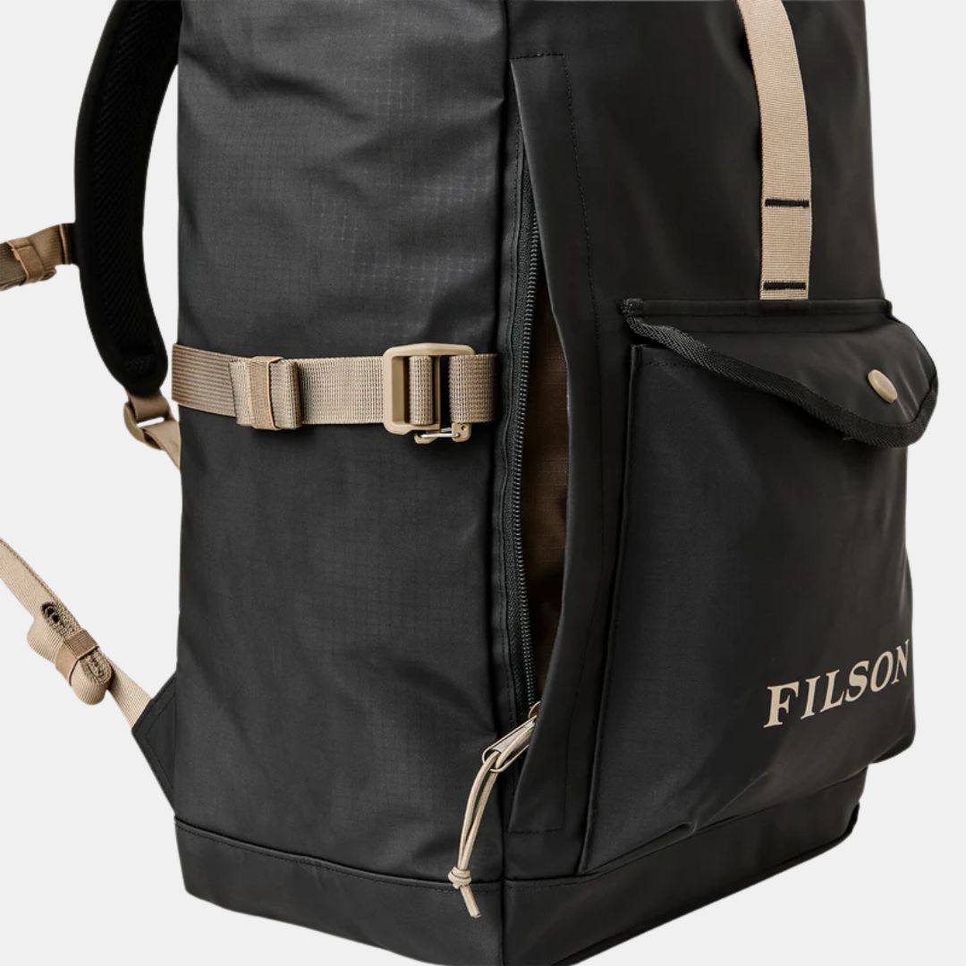 La bolsa principal está confeccionada con tejido antidesgarro 300D de peso medio y la parte inferior es de Oxford mate 600D. El panel trasero y las correas de hombro contorneadas están acolchados con malla espaciadora para mayor transpirabilidad y comodidad. Una correa de esternón ajustable ayuda a mantener las correas en su lugar. Un bolsillo exterior con solapa se superpone a un bolsillo lateral con cremallera para acceder rápidamente a pequeños objetos esenciales. El diseño de cierre enrollable con hebilla es un cierre de eficacia comprobada que evita la entrada de agua y facilita el acceso al compartimento principal. Esta mochila resistente al agua cuenta con un bolsillo interior para portátil y correas de compresión a cada lado para estabilizar cargas de diferentes tamaños.