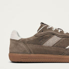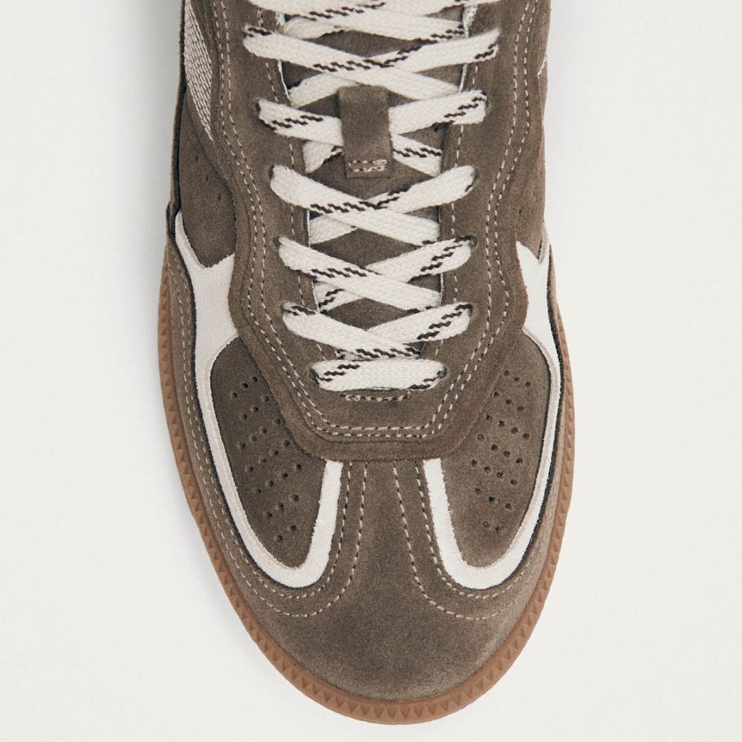 La sneaker Tb.490 è realizzata interamente in camoscio color topo. I dettagli in pelle color crema offrono un contrasto delicato, mentre i lacci tono su tono con strisce nere completano il design. Con una silhouette a taglio basso e suole in gomma, presenta dettagli classici come cuciture visibili e un logo in rilievo sulla linguetta e sui lati.