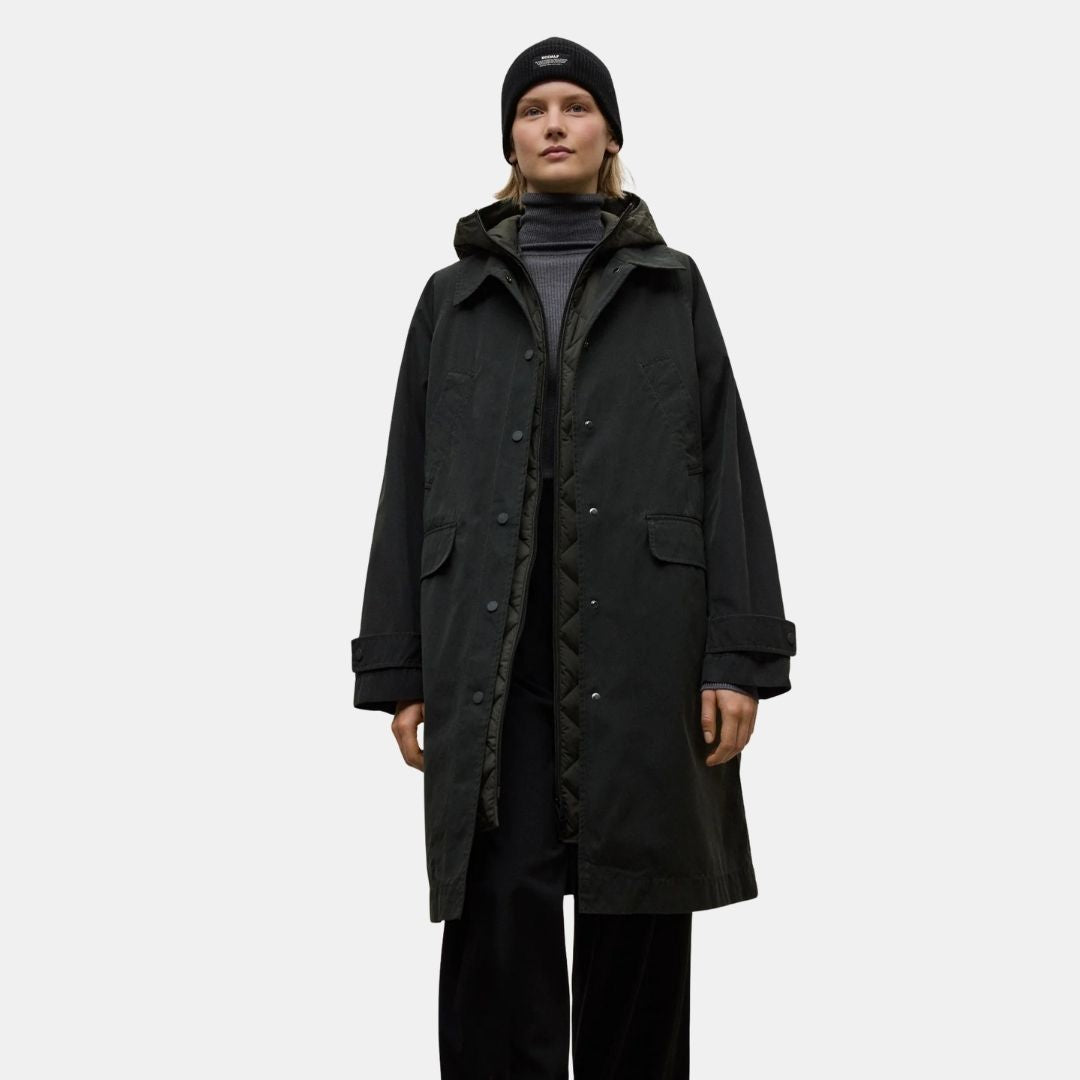 Il cappotto Hyden è realizzato con 54% Poliestere riciclato e 46% Cotone biologico, con imbottitura 100% Poliestere riciclato. Il poliestere riciclato riduce l'uso di risorse fossili, le emissioni di CO2 e il consumo di acqua ed energia, riutilizzando rifiuti plastici come bottiglie PET, mantenendo le proprietà del poliestere vergine. Indumento esterno: