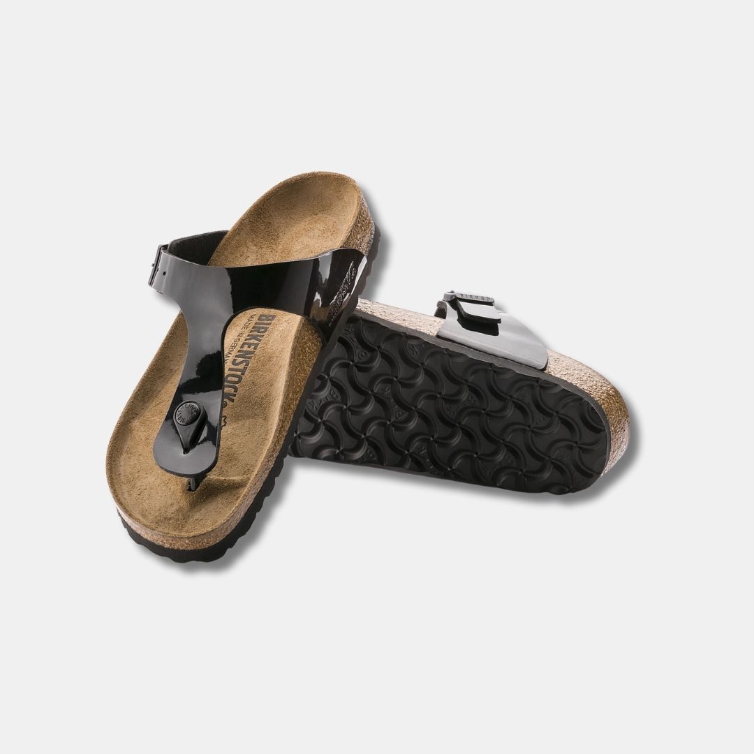 La moderna sandalia de dedo de Birkenstock. El Gizeh es un auténtico clásico con soporte exclusivo y un estilo refinado y minimalista. Se muestra en un divertido y brillante Birko-Flor® de charol.