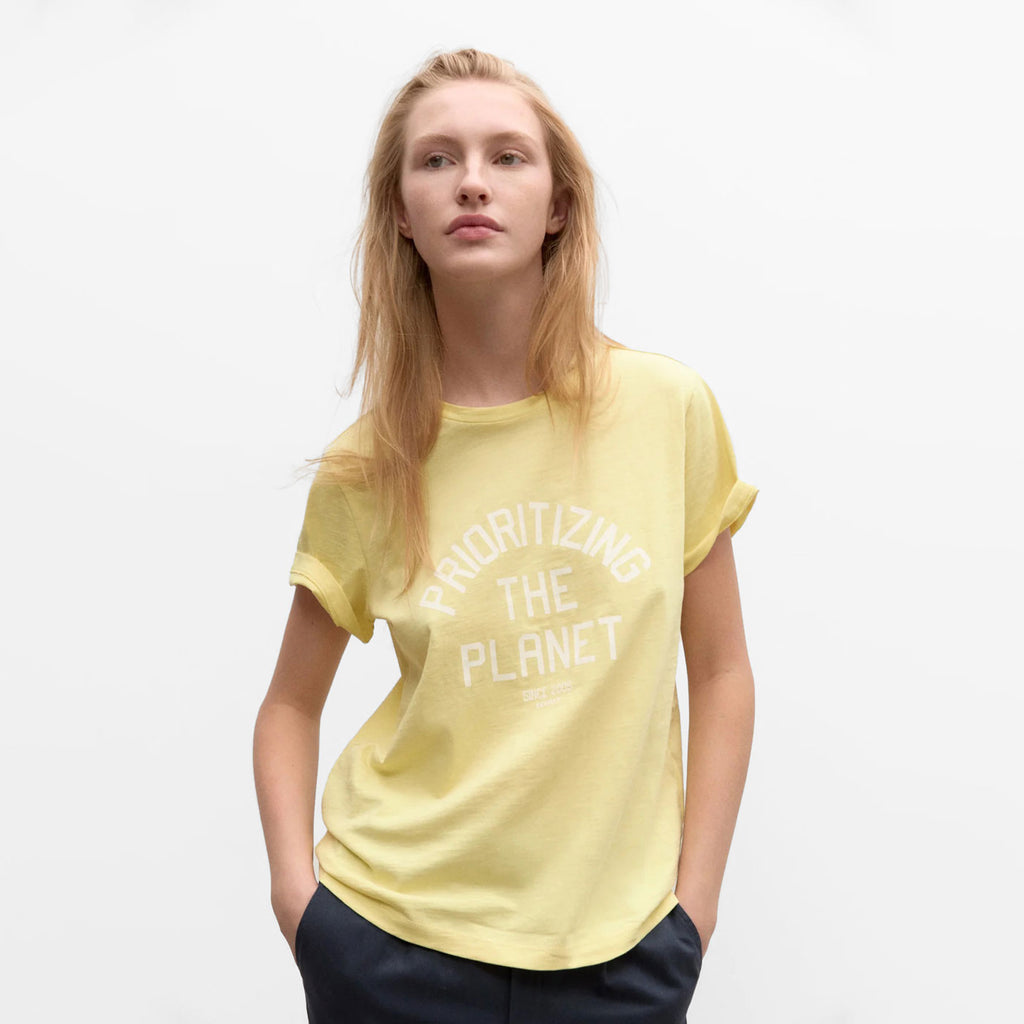 La camiseta Amazonas de manga corta tiene cuello redondo y el mensaje "Prioritizing the Planet" estampado en el pecho. Hecho de mono-material, 100% algodón orgánico. Nuestro Algodón orgánico comparte la misma calidad que el mejor algodón convencional, pero sin el impacto negativo asociado en el medio ambiente. Se cultiva sin el uso de pesticidas, insecticidas o fertilizantes, utilizando buenas prácticas de conservación de suelo y agua. Una camiseta que fomenta la economía circular.