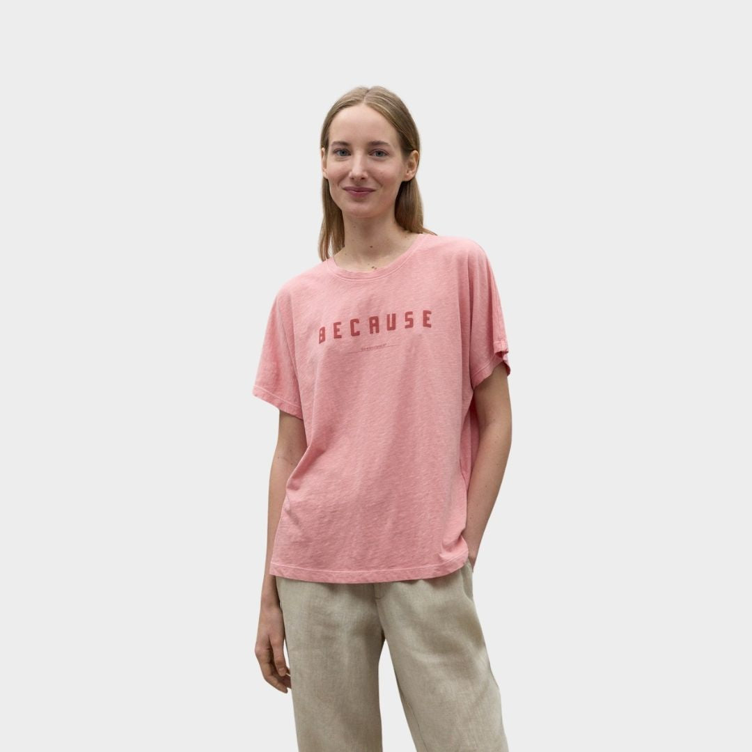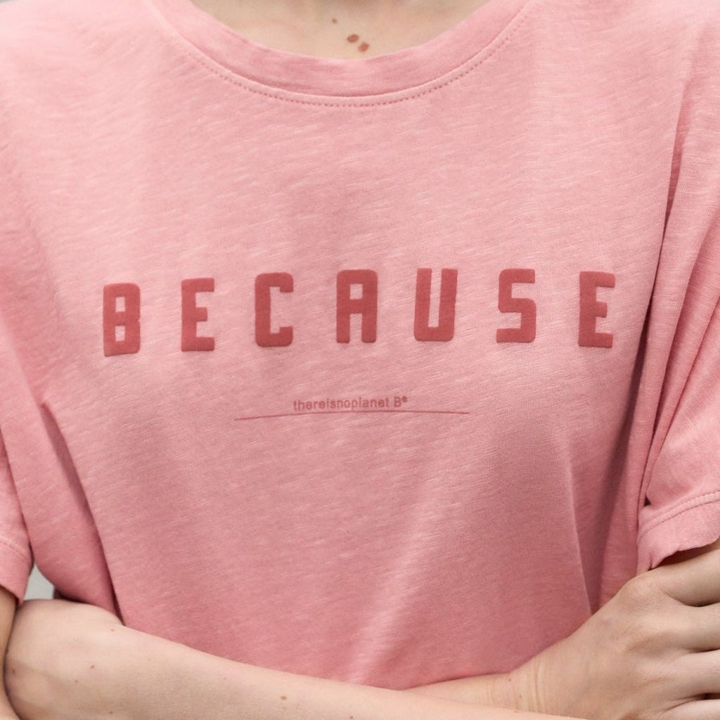 La camiseta Kemi está hecha con 80% Algodón orgánico cultivado de manera natural que nos permite reducir el uso de agua empleada en el proceso de producción. Además lleva impreso "Because", que hace referencia al claim "Because There Is No Planet B®.