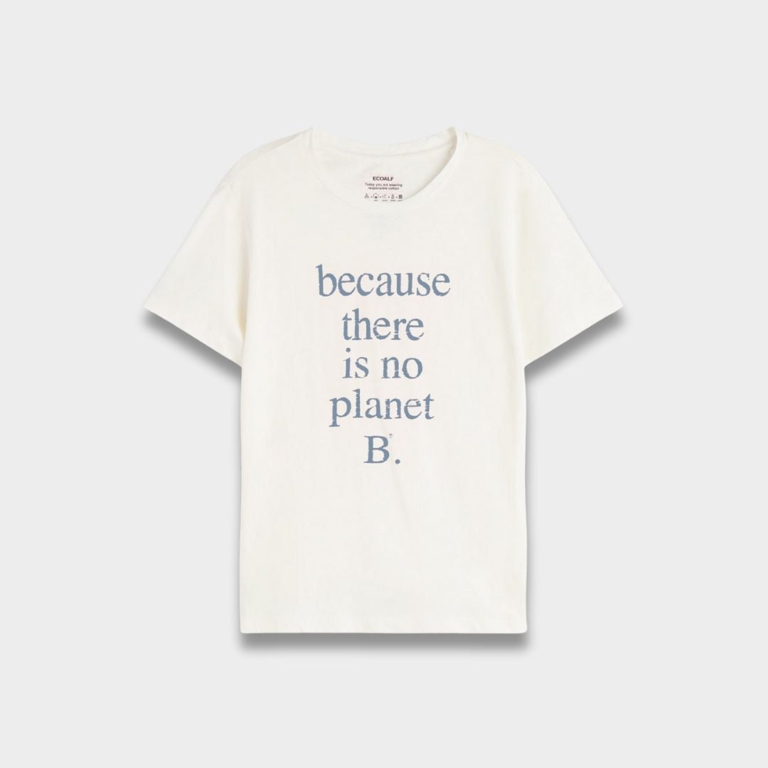 La camiseta de manga corta Lovisa está hecha de 80% Algodón orgánico, material cultivado de manera natural que nos permite reducir el uso de agua empleada en el proceso de producción. en la parte delantera encontrarás el claim impreso: Because There Is No Planet B®.