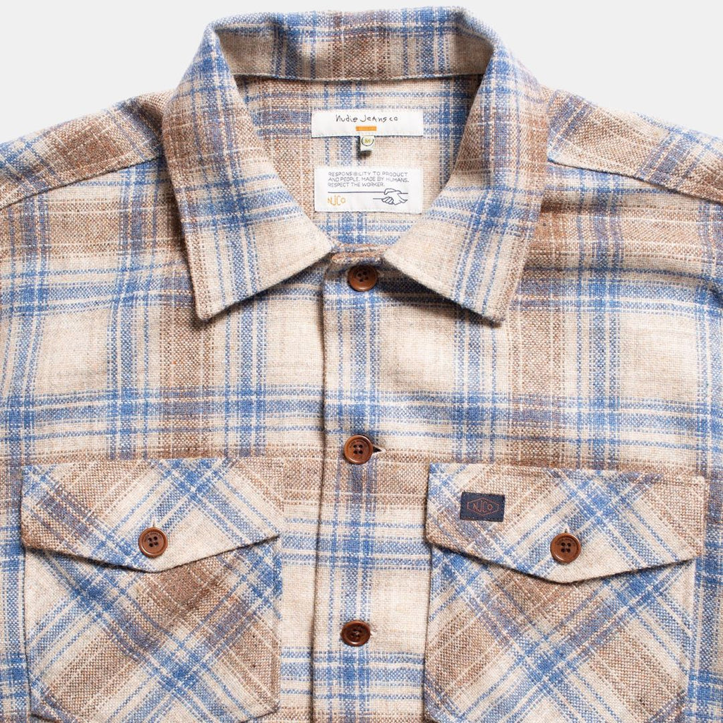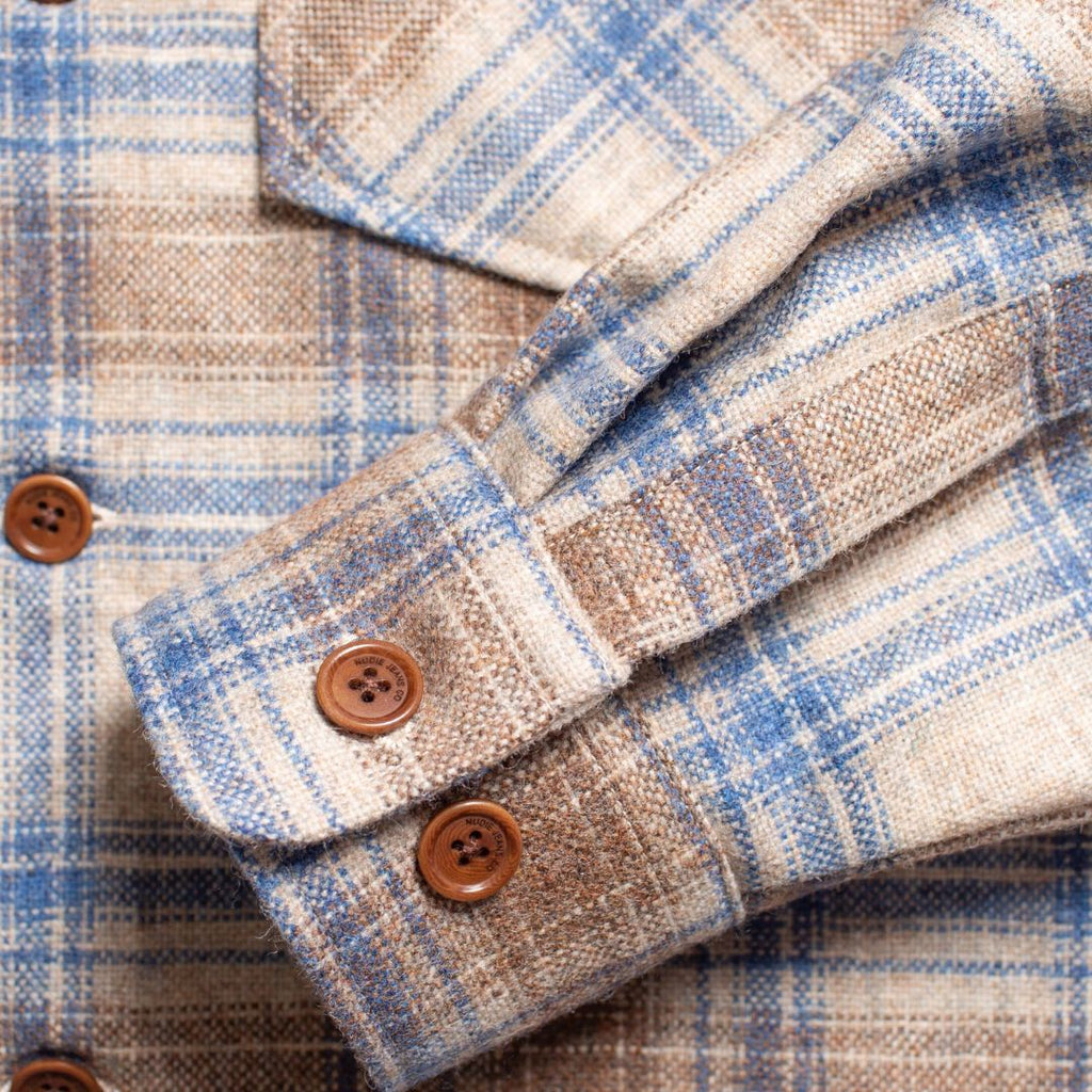 Camisa confeccionada en cuadros con tonos cálidos y terrosos iluminados por un azul claro. El tejido mezcla lana reciclada y poliamida, lo que nos brinda una calidad resistente y para actividades al aire libre con una textura rugosa y una sensación de sequedad en las manos. Las mangas están forradas con forro de poliéster reciclado. Cuando compras esta camiseta, puedes estar seguro de que hemos pagado nuestra parte del salario digno por ella.