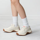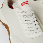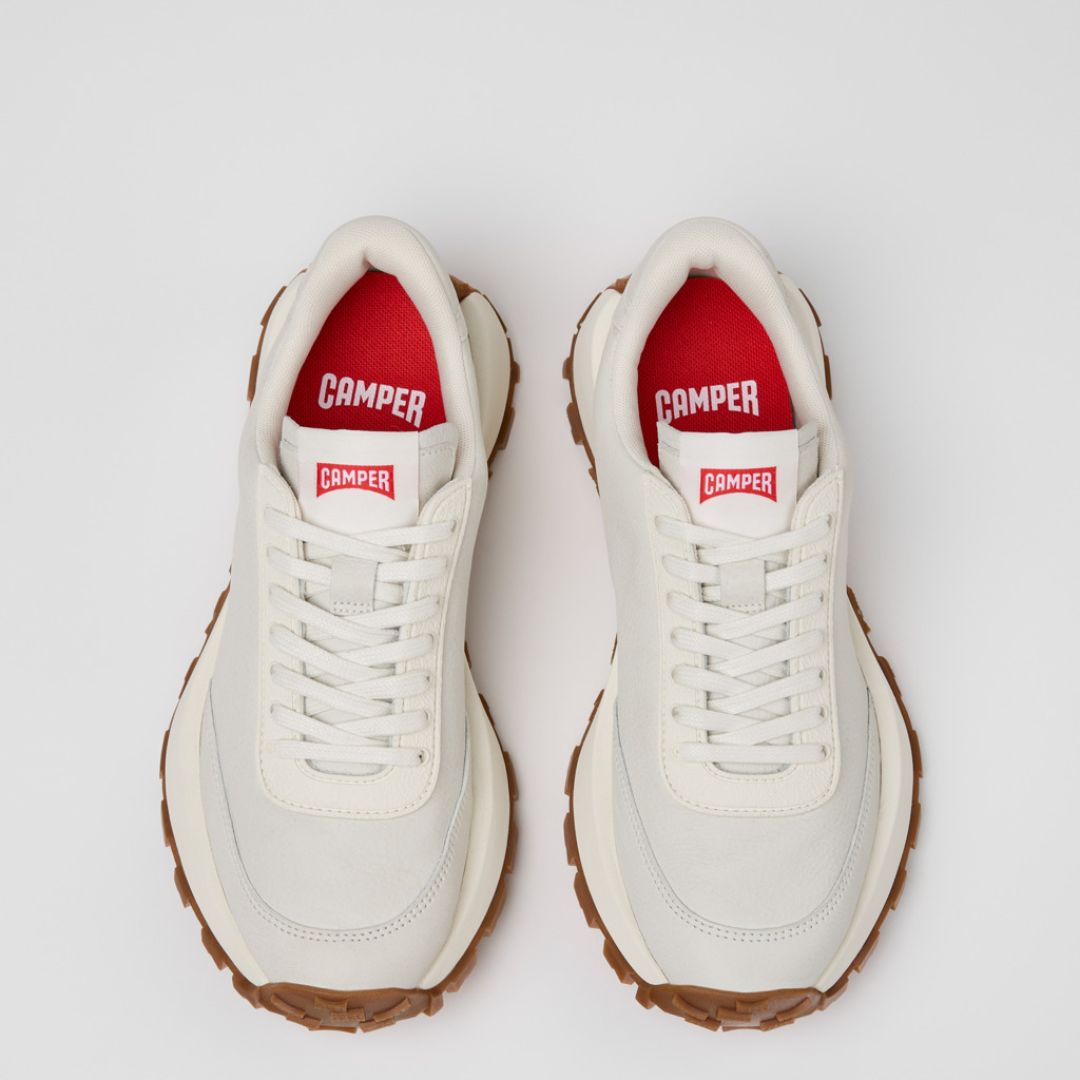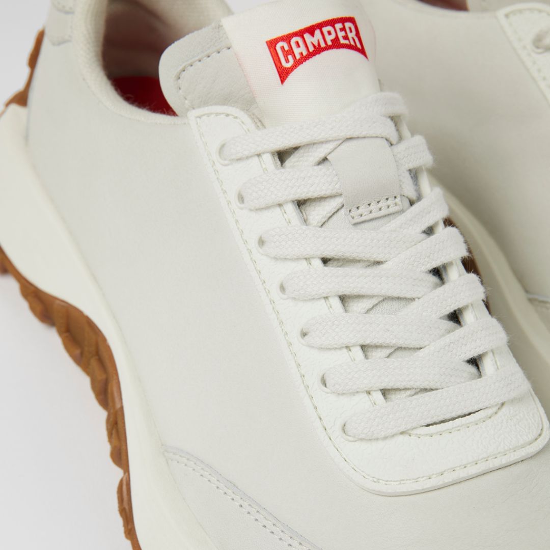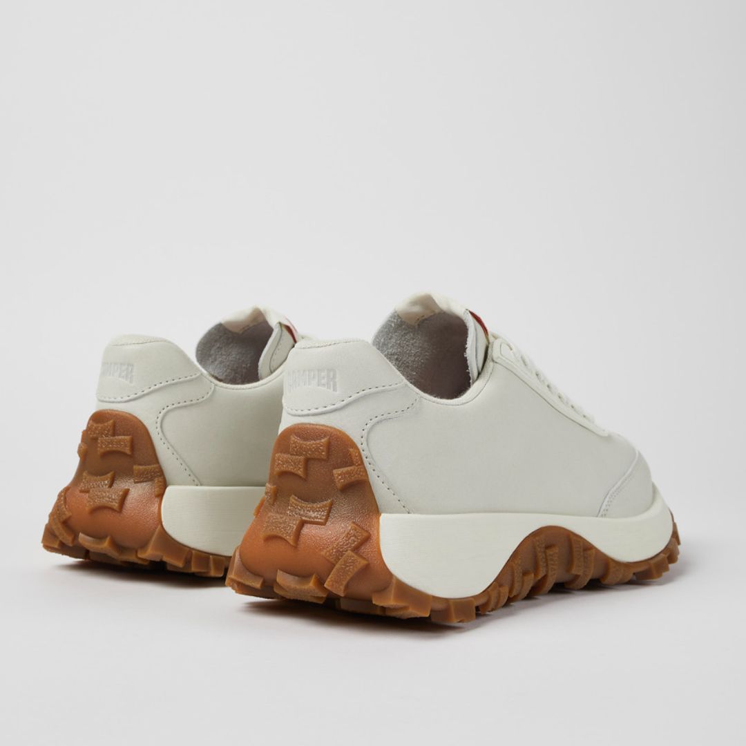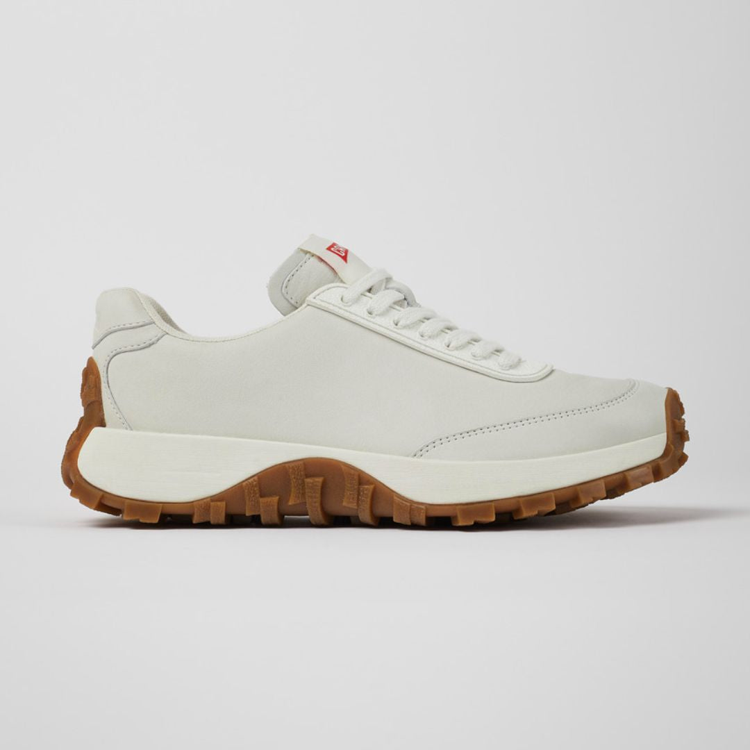Ténis brancos para mulher em pele de vaca não tingida com palmilhas OrthoLite® Recycled™, entressolas em EVA e solas Vibram Ecostep (30% recicladas).
