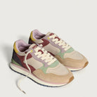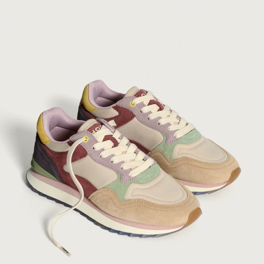 Sapatilha de estilo "retro" em combinação de cores e materiais. Detalhe do logótipo na parte traseira. Sola serigrafada. Fecho com atacadores.