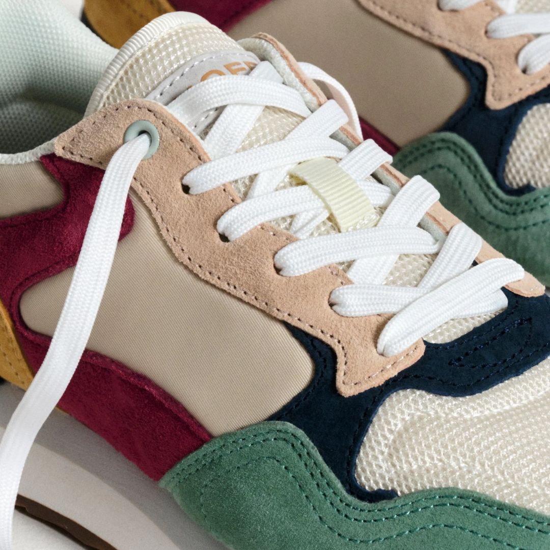 Sapatilha de estilo "retro" em combinação de cores e materiais. Detalhe do logótipo na parte traseira. Sola serigrafada. Fecho com atacadores.