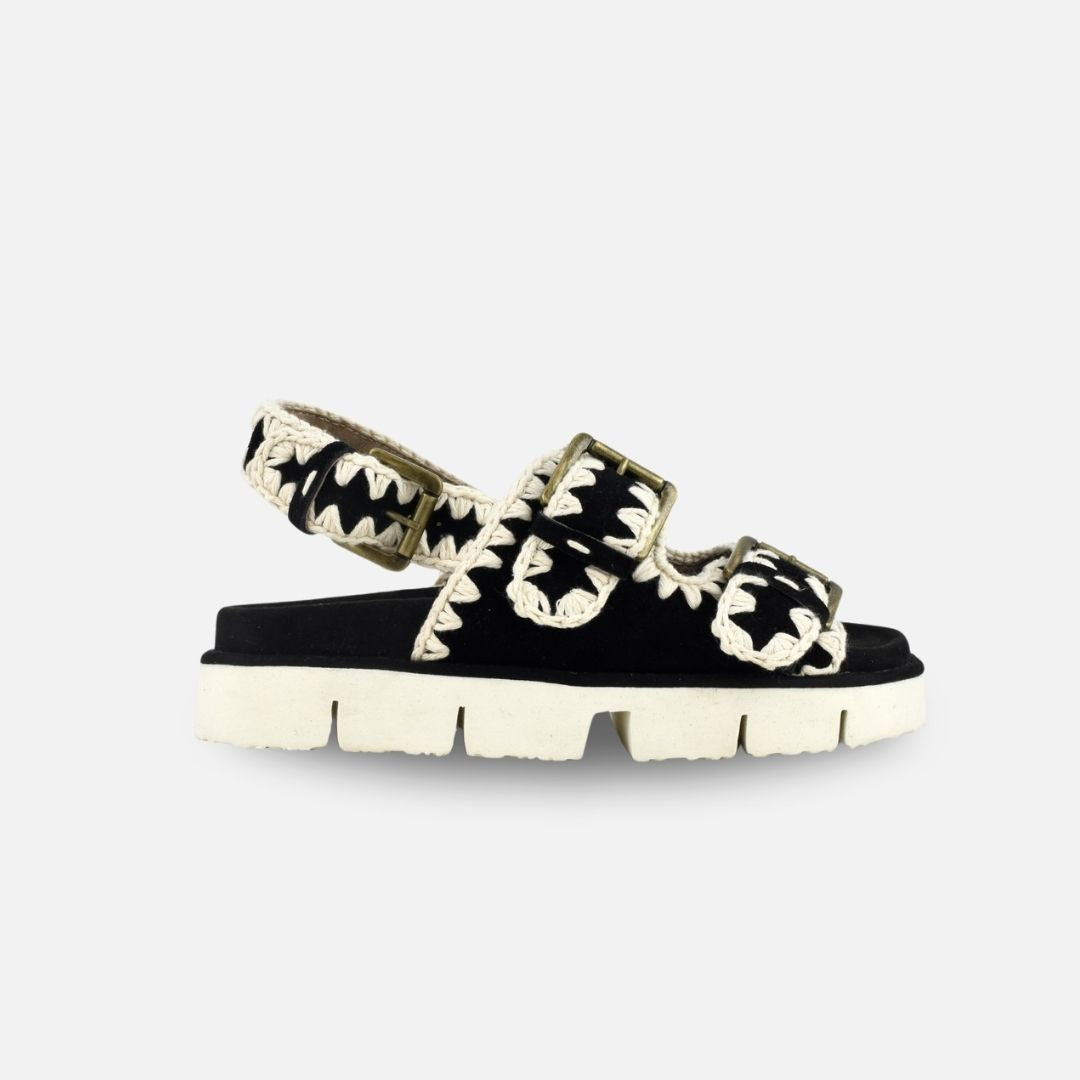 As novas sandálias bio com fivela oferecem o look perfeito para um verão descontraído e elegante. Completo com duas tiras frontais, uma tira traseira, costura de crochê exclusiva da Mou, sola leve em EVA e palmilha em camurça para maior conforto.